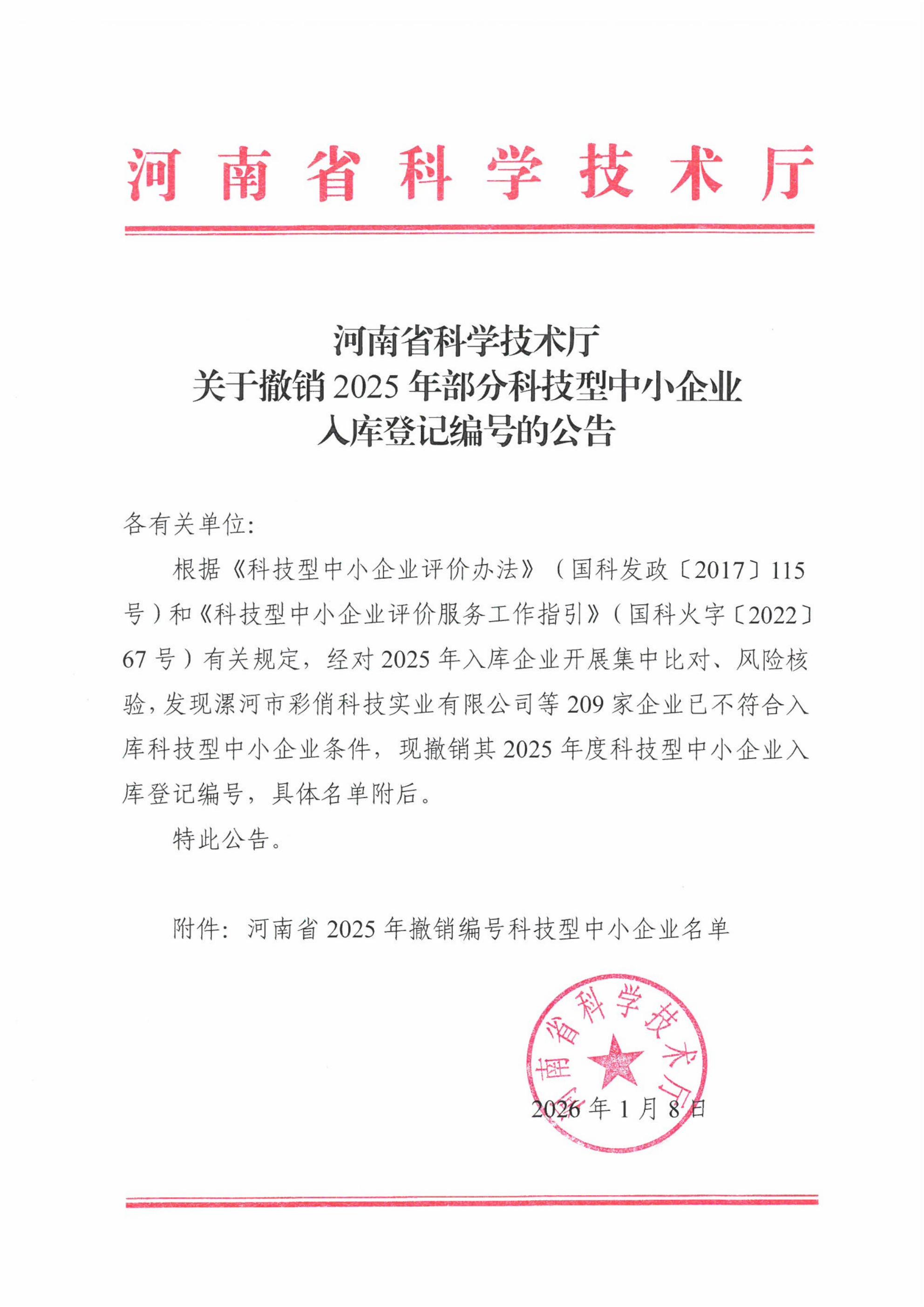 河南省科学技术厅关于撤销2025年部分科技型中小企业入库登记编号的公告.jpg PICTURE